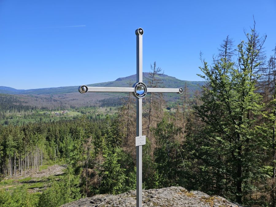 Unser heutiger, 9 km lange Wandertipp startet in Ludwigsthal. Geparkt werden kann am Parkplatz gegenüber dem Schloss in Ludwigsthal. Mit der Waldbahn kann man auch bequem anreisen. Wir überqueren die B11 und folgen der Schleicherstraße, queren die Bahnlinie bei einer Unterführung und biegen rechts dem Böhmweg folgend ab. Eine kleine Brücke führt uns wieder an eine Teerstraße, die wir erneut queren. Nun gabelt sich der Weg und wir wählen die steile Nummer 26 durch den Kahlschlag. Zwar wurde hier der Wald entfernt, aber es wimmelt trotzdem vor lauter schillernden Sandlaufkäfern, die das sandige und sonnige Terrain gerne nutzen. Nach einem etwas anstrengendem Anstieg geht es leicht links in einen Trampelpfad in den Wald zurück und nach einiger Zeit kommen wir an eine Bank, von der aus wir den malerischen Ausblick in Richtung Falkenstein genießen. Wir gehen weiter, passieren ein kleines Marterl und laufen den Hang leicht bergab. Von hier aus lässt sich eine hohe Felsformation im Wald erspähen. Geht man weiter, zweigt rechts ein kleiner, nicht beschilderter Trampelpfad in Richtung dieser Felsformation ab. Wer mag, kann diesem folgen und kommt beim Dachs´nstoa (750 m. ü.NN.) raus. Einheimische haben hier ein wunderschönes Kreuz mit Glaskugel installiert. Ein Blick durch diese zeigt eine auf dem Kopf stehende Welt.