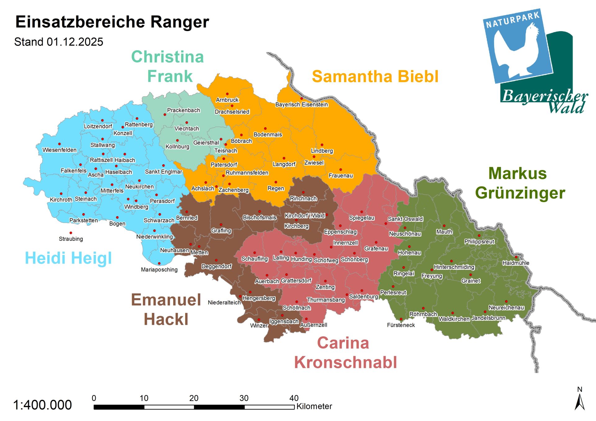 Aufgrund seiner beachtlichen Größe von 278.272 Hektar hat der Naturpark Bayerischer Wald fünf Ranger eingestellt, welche in verschiedenen Gebieten eingesetzt werden. Jeder Ranger betreut im Schnitt 18 Gemeinden. Die Gebietsaufteilung beruht auf naturräumlichen Schwerpunkten, wodurch sie sich teilweise von den Landkreisgrenzen abweicht. So wurde etwa das Gebiet um Rusel und Oberbreitenau zusammengefasst, auch der Brotjacklriegel wurde nicht aufgeteilt.